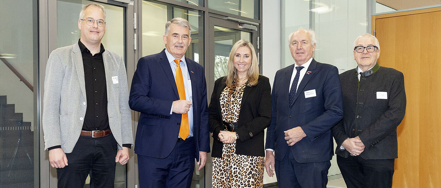 Dr. Gero Kellermann, Akademie für Politische Bildung, Ulrich Wagner, Hauptgeschäftsführer der Handwerkskammer für Schwaben, Bayerns Kultusministerin Anna Stolz, Franz Xaver Peteranderl, Präsident des Bayerischen Handwerkstages (BHT) und BHT-Geschäftsführer Dieter Vierlbeck (v.l.n.r.) bei der Veranstaltung in Augsburg.